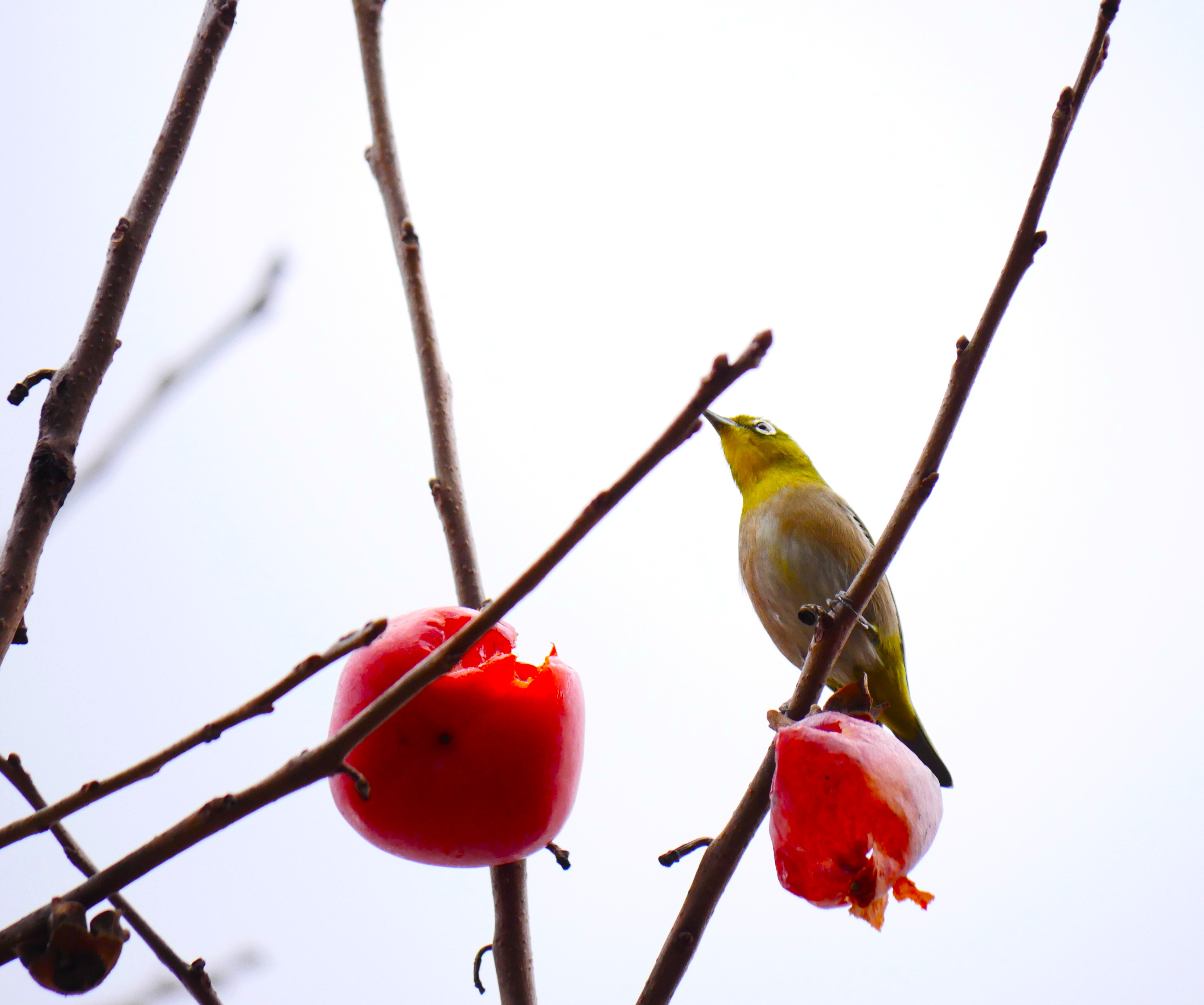 Behind the temple runs the Nobidome Irrigation Canal, and a small path follows the stream.Around Nobidome Bird Forest, the dense woods echoed with the sound of birds calling to one another.On a persimmon tree, Japanese white-eyes were busy pecking at the fruit.Farther down the canal, a heron stood motionless, waiting for prey where no one could see it.