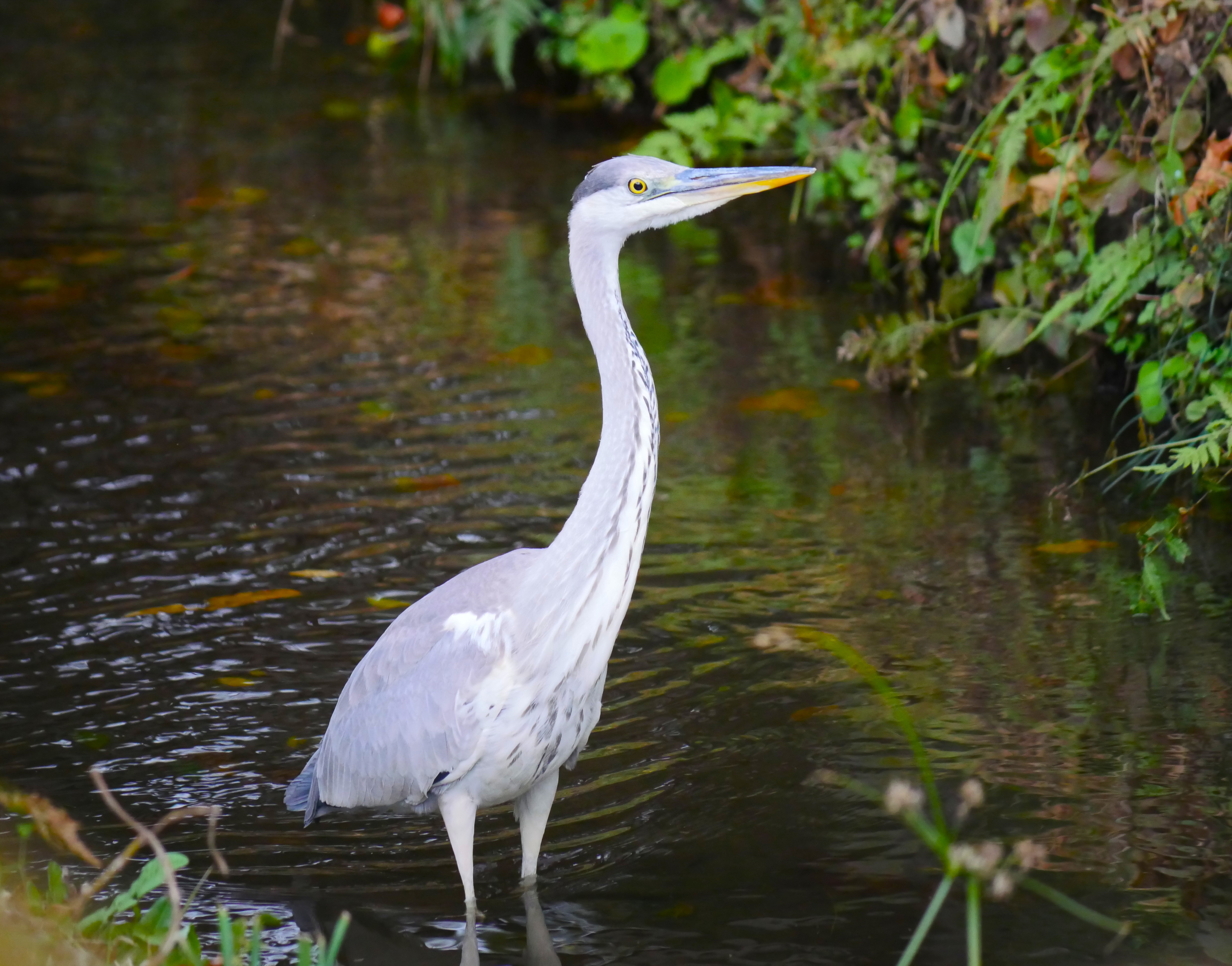 そのまま武蔵野線をくぐり抜け、平林寺方面へ向かいます。平林寺の裏手には野火止用水が流れており、小川沿いの小道をゆっくりと進むことができます。野火止野鳥の森あたりでは、鬱蒼とした林の中で鳥たちのさえずりが響き、柿の木ではメジロが忙しそうに食事をしています。用水の奥では、鷺が人目を避けるようにじっと餌を狙っていました。