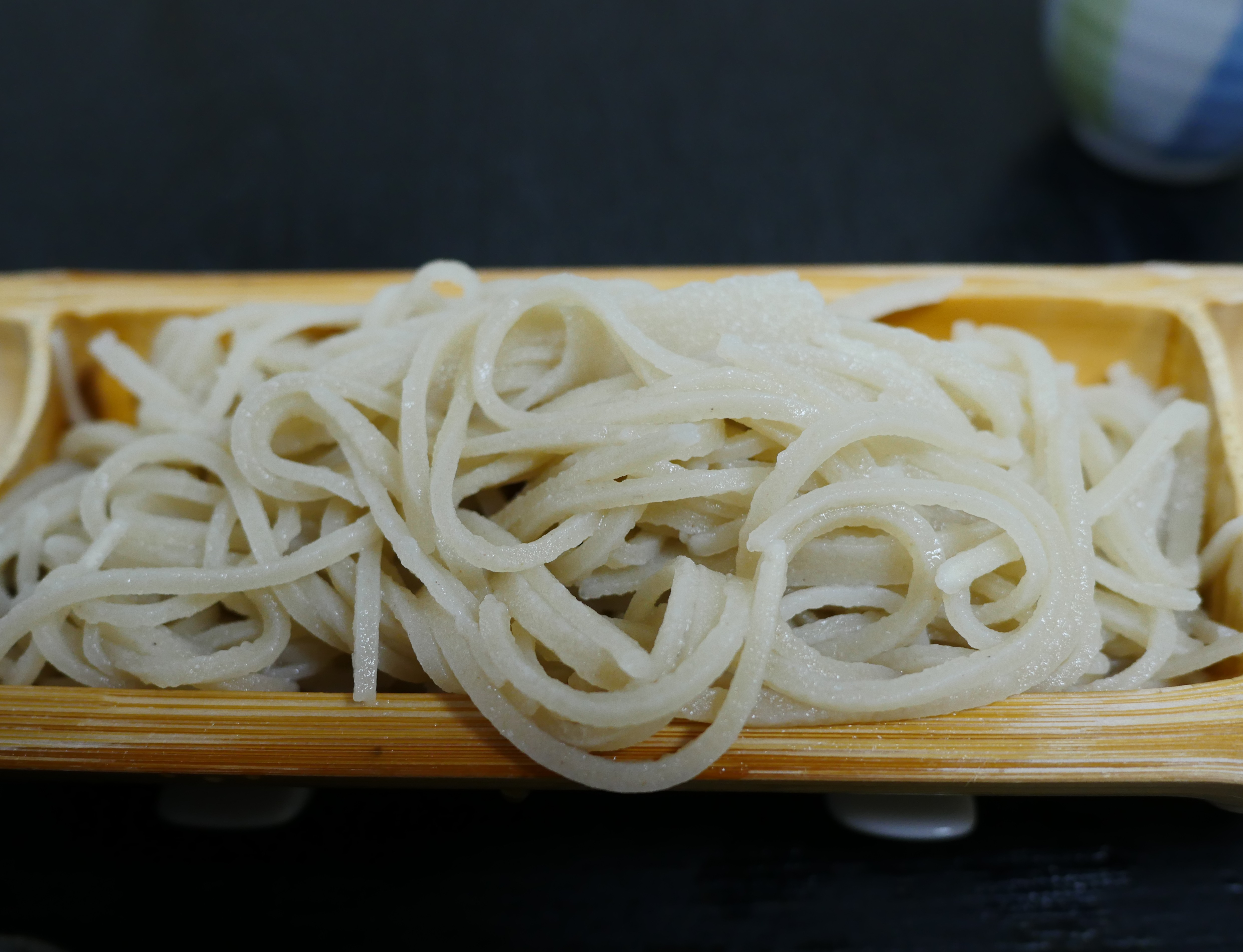 しばらくして運ばれてきたのは、乳白色で水晶のような美しい更科蕎麦。ひと口すすると、こりっとした食感で、品のよいほのかな風味が広がります。待った甲斐のある、なかなか出会えない蕎麦でした。